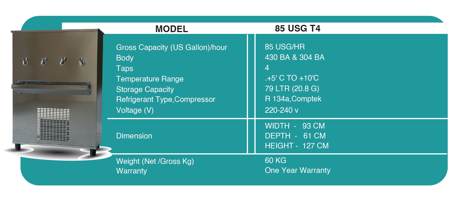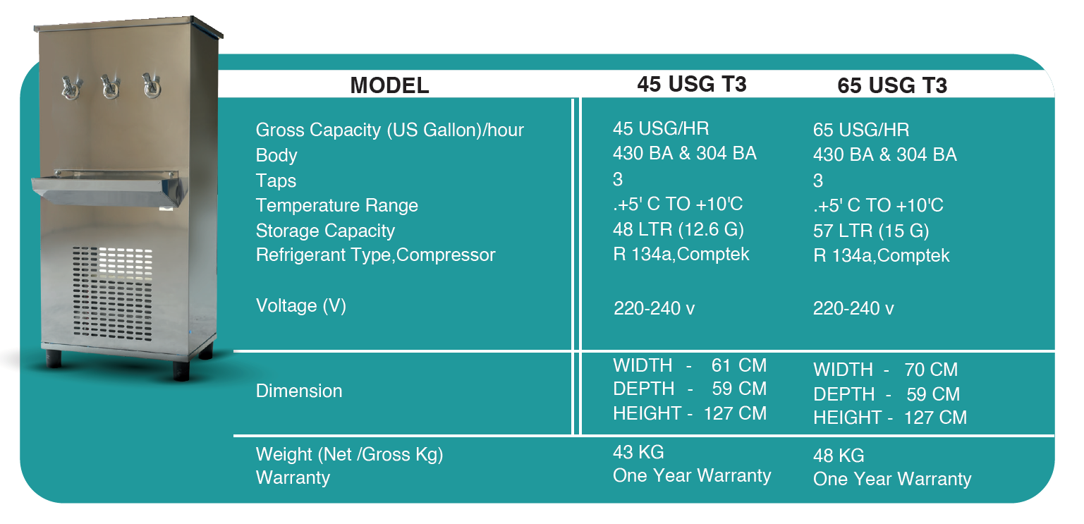 "Our Stainless steel body drinking water Coolers come in Cooling Capacities ranging from 25 USG - 250 USG and with Push Button Taps (2 taps – 5 Taps). All Our Drinking Water Coolers are supplied with a Standard single-stage candle water Filter. We have an exceptional reputation for customer support and model availability with premium features. With over 13 years of experience designing equipment exclusively for standard and customized systems, we ensure the highest quality standards for the global market. Delivery schedules are promptly executed to meet market deadlines and International Standards. Our water coolers are used in Worker Accommodations, Labor Camps, Mosques, Schools, Restaurants."