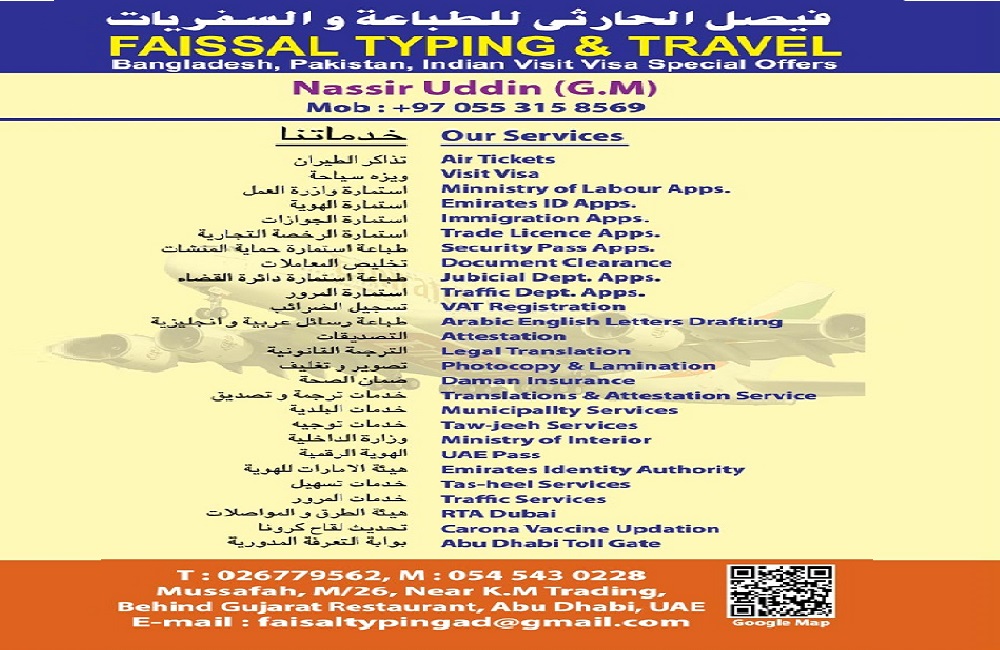 ★ All kinds of Typing, Travel and photocopy services are available "FAISAL TYPING TRAVEL & TOURISM "We are providing you all Govt. related transections services for example MOI, MOHRE, ICA, Golden Visa, Visit Visa (New Appling & Extension)Tasheel, Tadbeer, Tawjeeh, Tawafouq (Labour Complaint) Public Notary, Equivalency of academic certificates, MOFA Attestation, Abu Dhabi, Dubai Police Clearance Certificate, Federal Tax Authority, DRB Salik Registration & Recharge, Legal Translation, Personal PRO Services."★