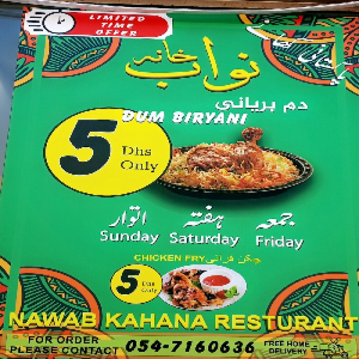 Nawab Khana Restaurant is located in Musaffah M/37 - Abu Dhabi-U.A.E. Nawab Khana has been to bring the very best flavors from around the world, inspired by the vast array of ingredients and flavors, to combine the best of eastern and western cultures. Where diners can experience a selection of dishes from Breakfast, Rotis, Rice Items, Veg, Chicken, Mutton & Fish Dishes, Dal Items, Mangloren Dishes, Chinese Dishes, Noodles, Beverages, Grills, Thali, Deserts, that not only complement each other but combine perfectly.