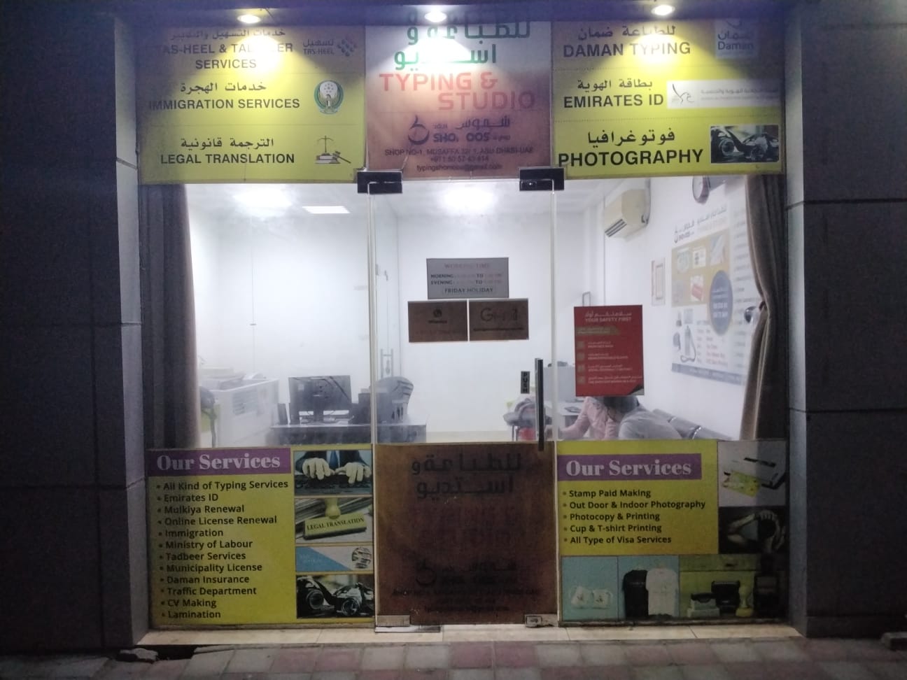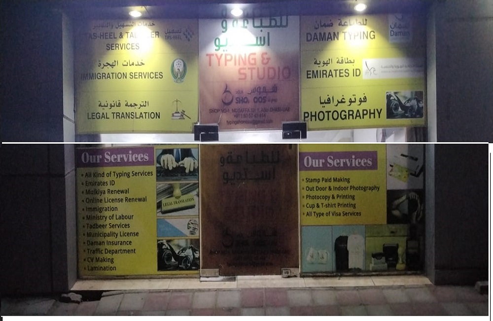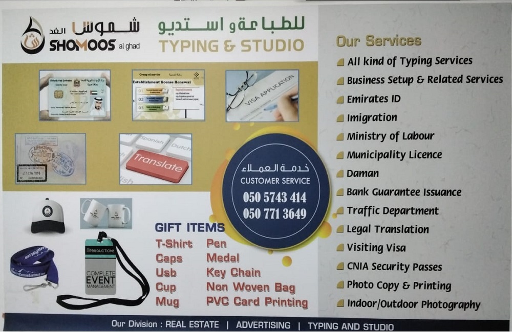 Shomoos Al Ghad Typing center is strategically established and located in 15th St - Musaffah Industrial - Abu Dhabi - U.A.E. Typing centers in UAE well-equipped to offer basic typing training to the interested individuals looking for secretarial job in offices. Basic typing skill is often required for all types of text or word processing based jobs therefore typing centers are essentially producing skilled typists at reasonable rates.