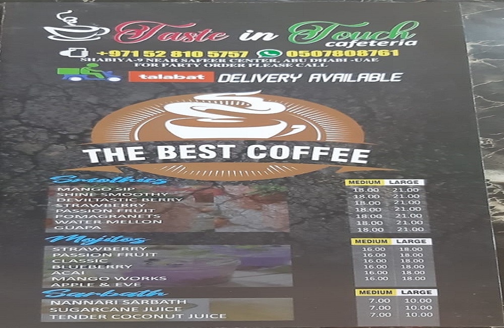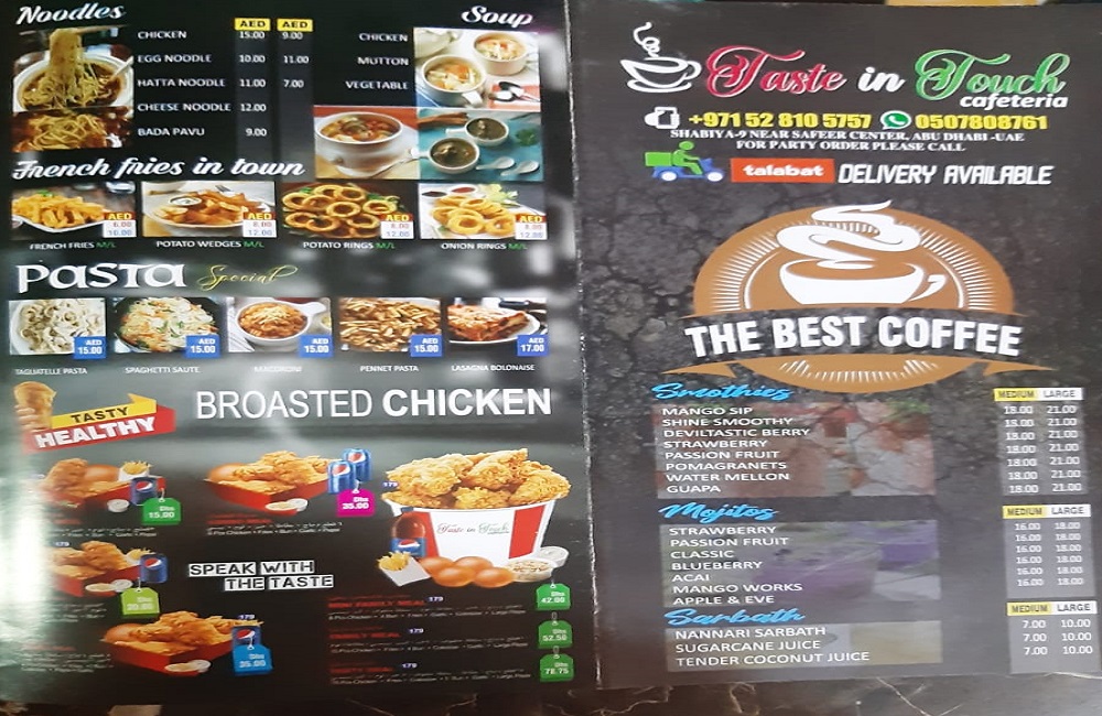 Taste in Touch Cafeteria is one of the best cafeteria located in Mussafah Shabiya 9 Near Safeer Mall, Shabiya Sector 9-MBZ City Mussafah Community - Abu Dhabi - U.A.E. Each and every item on the menu is of great taste and cooked fresh. The place is enchanting. On one hand, the lovely strong aroma of coffee is simply addictive, and on the other the delicate scent of freshly ground spices. We create the most amazing specialty coffee and burgers in Abu Dhabi. People love eating our carving food. Try our specialty coffee and burgers, you will love it.